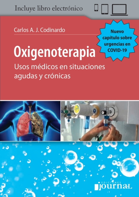 Oxigenoterapia: Usos médicos en situaciones agudas y crónicas, desarrolla contenidos sobre la utilización terapéutica del oxigeno medicinal, desde situaciones de emergencia y uso en enfermedades respiratorias frecuentes en internación general, como también en tratamientos crónicos respiratorios. Consta de doce capítulos donde médicos referentes neumonólogos de Argentina y España aportan una actualización pormenorizada de este particular tratamiento de progresiva demanda (en particular en situaciones como la actual pandemia de covid-19